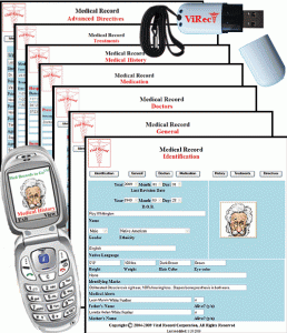 Med Records to Go(tm) stores health information vital to medical professionals and emergency responders. A computer application called Med Records to Go(tm), that stores electronic medical records, can help reduce errors in emergency conditions, as well as in hospital or medical clinic admissions. Introduced by the Vital Record Corporation in November, 2006, Med Records to Go(tm) uses flash drive technology to record and store health information for emergency viewing by medical personnel and for electronic transmission to medical facilities using HL7 standards.